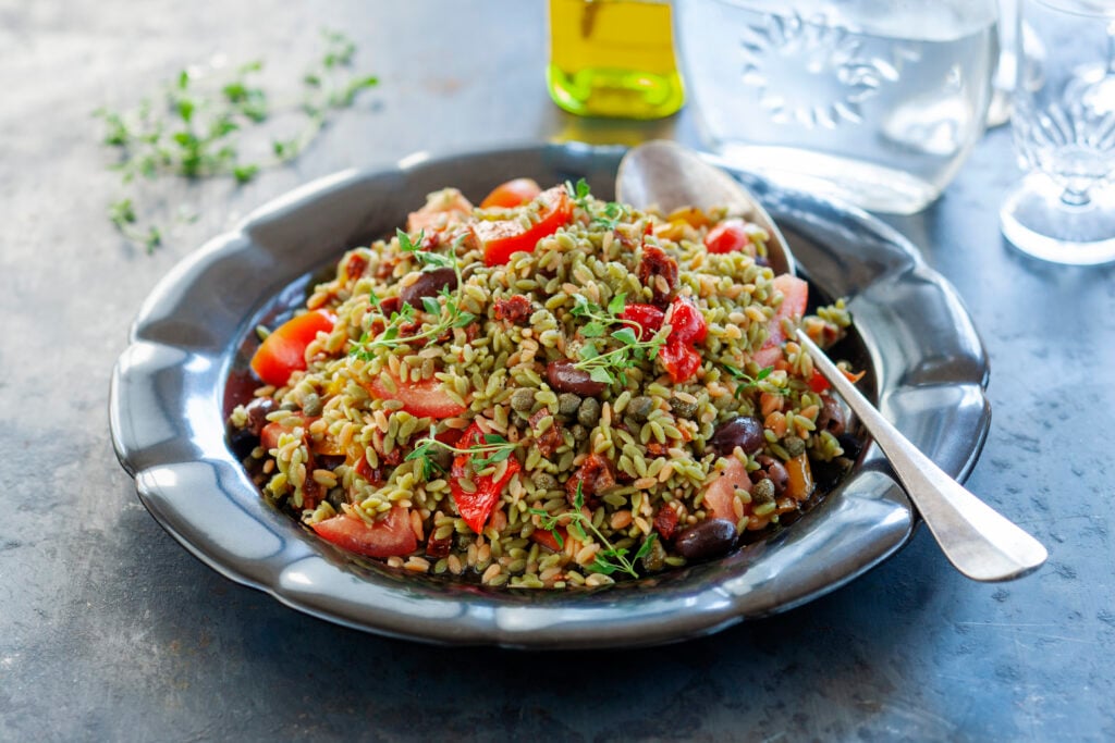 Matig sallad med ris av gröna ärter & röda linser tillsammans med färska och soltorkade tomater, oliver och kapris. Passar såväl till vardags som helg.