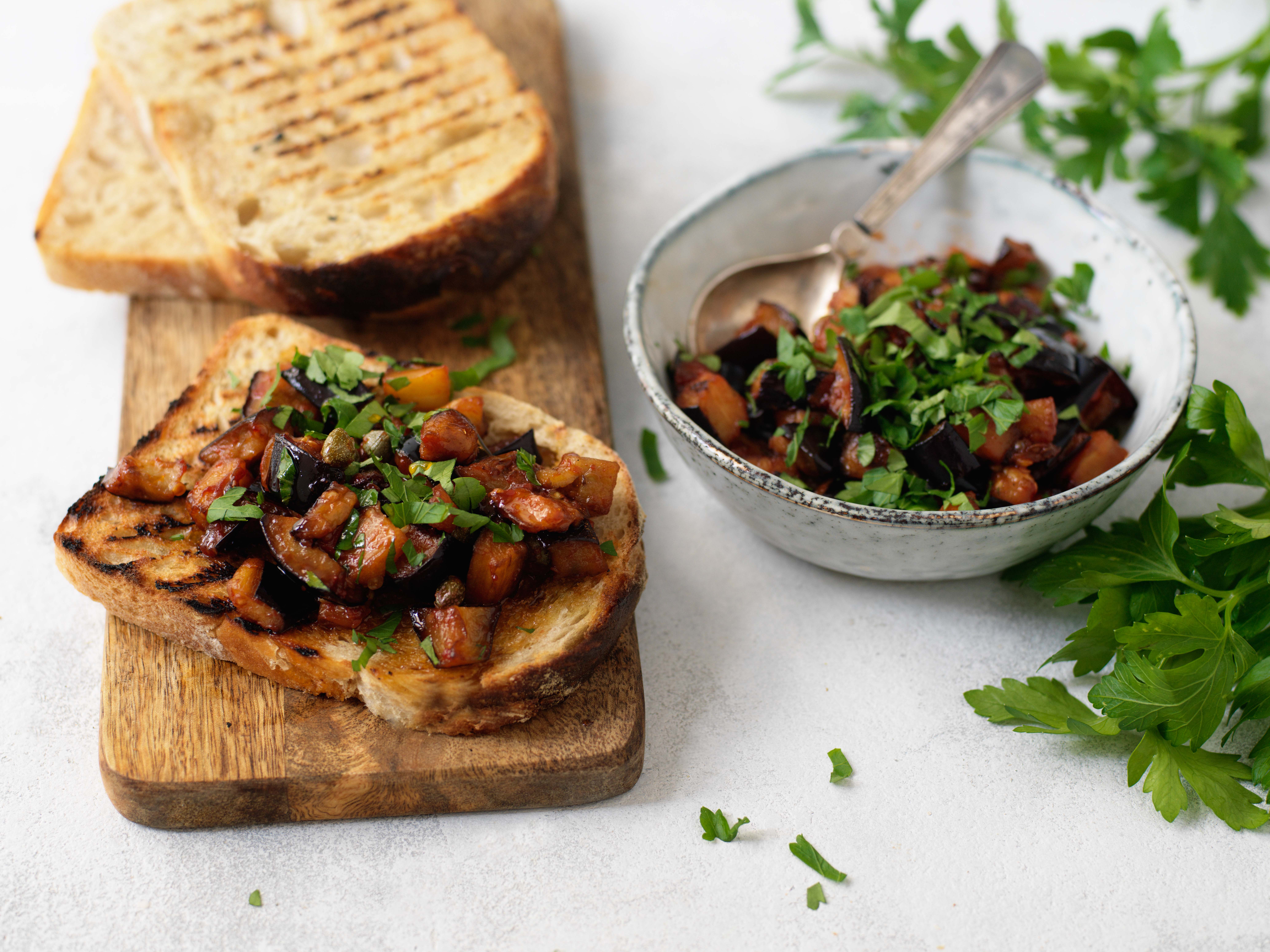 Aubergine med olivolja, kapris och färska örter. Passar utmärkt att servera på ett gott bröd.