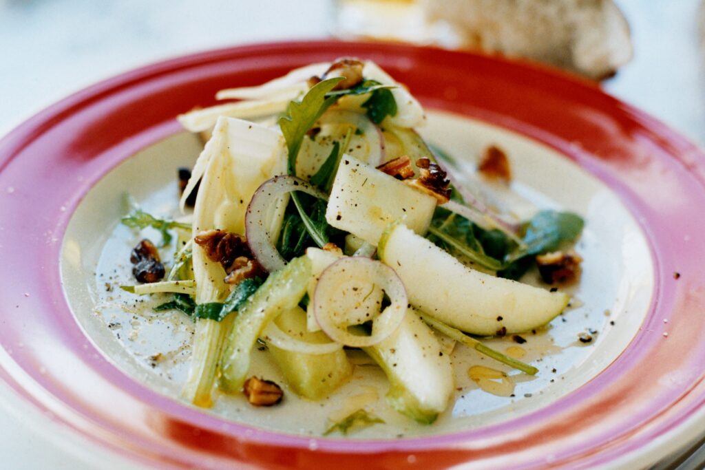 En frisk fruktig sallad med äpple, selleri, rucola, melon och valnötter