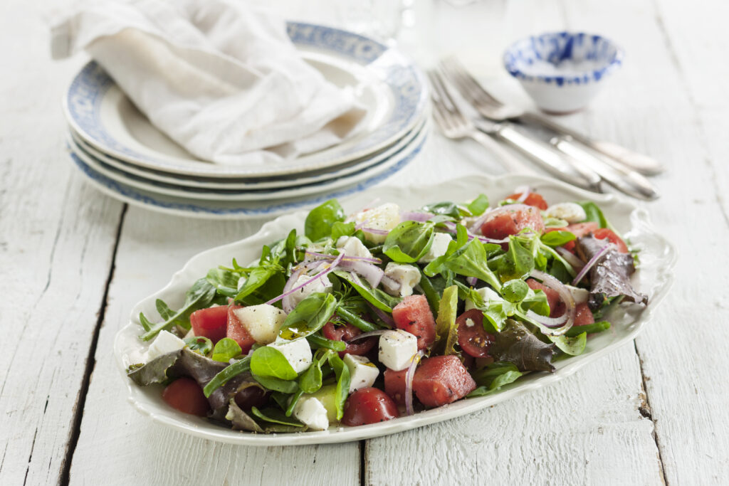 Melonsallad med fetaost och haricots verts. Perfekt på buffén.