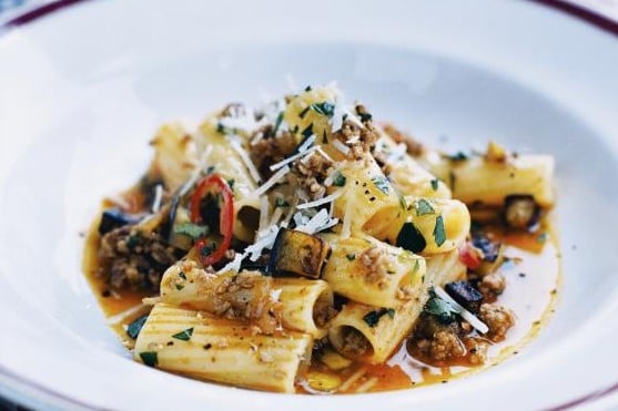 Ragù på nötfärs med aubergine, chili och vitlök. God och mustig köttfärssås som passar utmärkt med pasta.