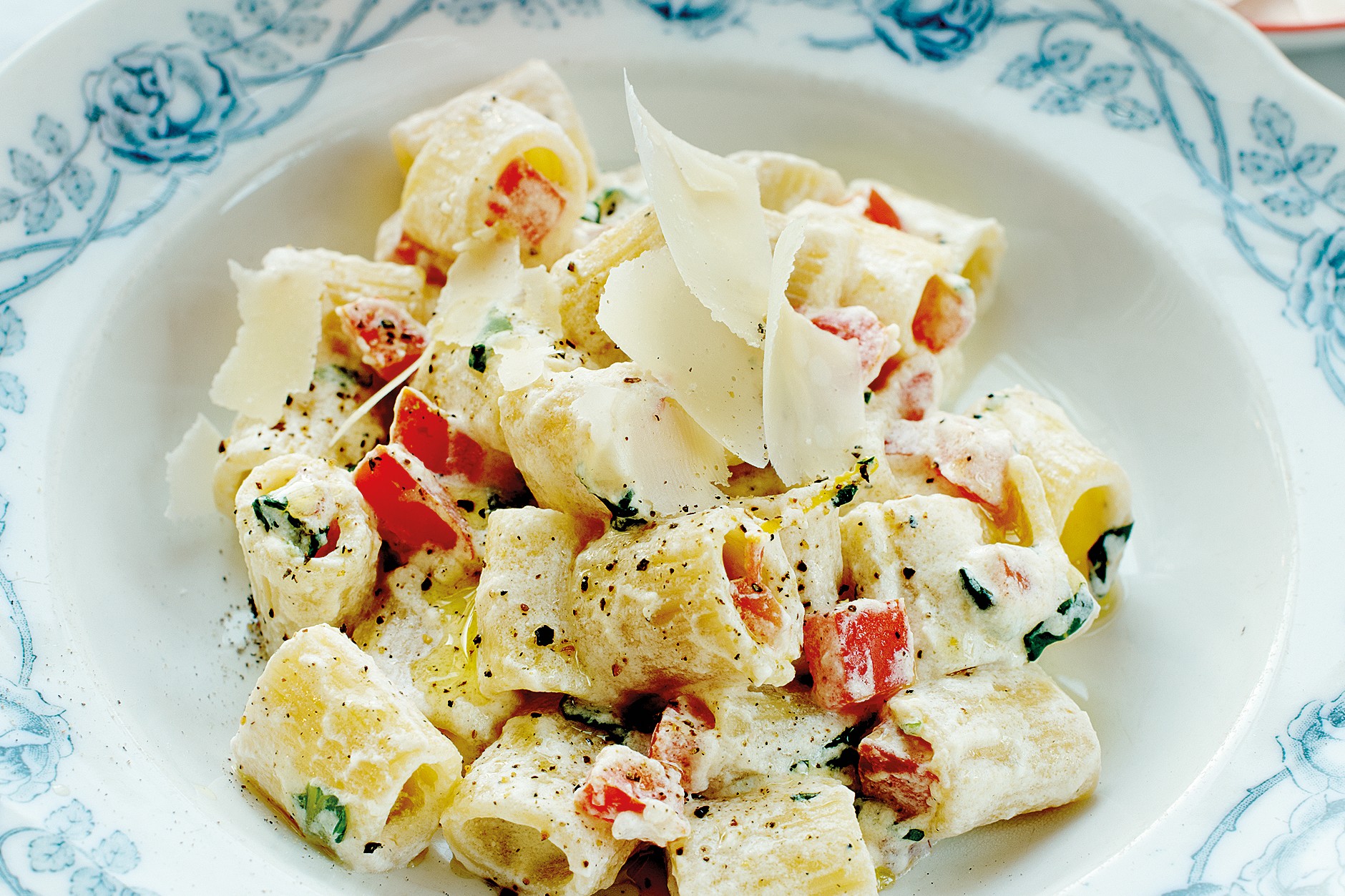 Mezze Maniche con ricotta e pomodoro – krämig pasta med ricotta och smakfulla tomater.