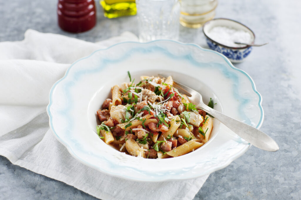 Pasta med knaprig pancetta och kyckling som serveras i en mustig tomatsås. Snabblagad och enkel pastarätt perfekt till vardagsmat.