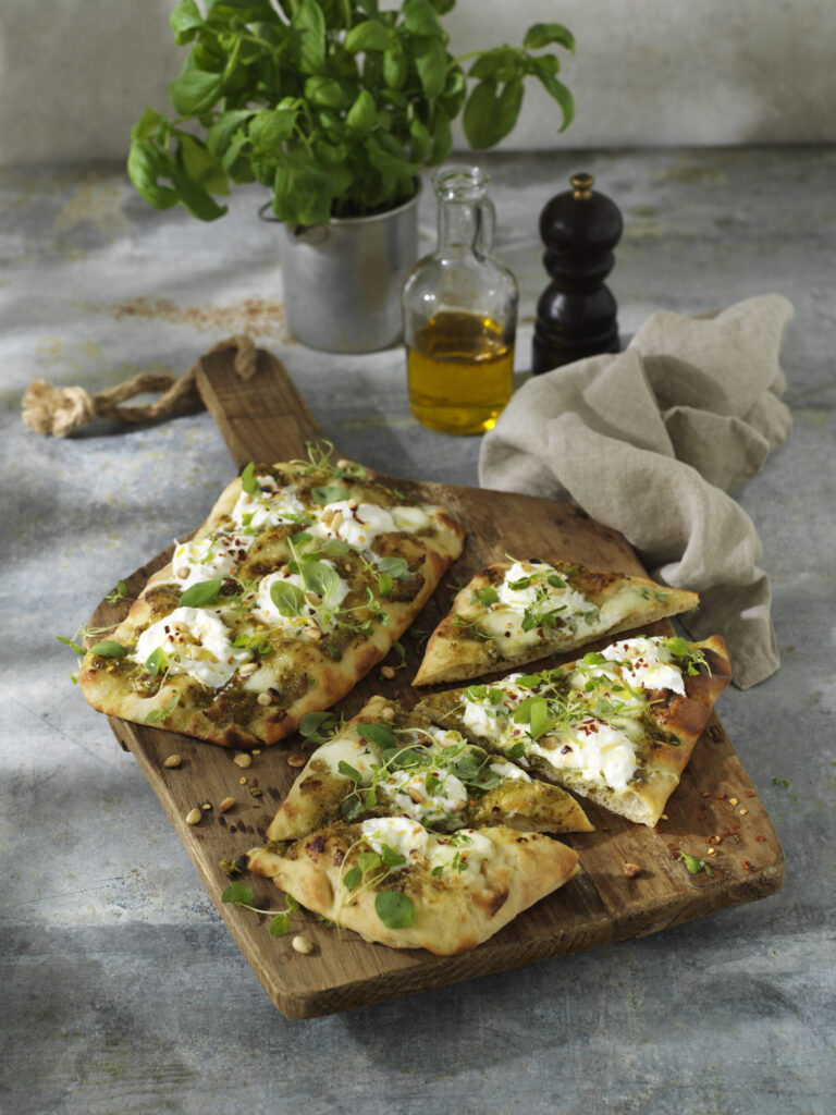 Mini Pinsa passar perfekt som lunch eller som ett matigare mellanmål. Här har vi gjort en Pinsa Bianca, vilket betyder att den saknar tomatsås men i stället är toppad med örtig pesto och krämig miniburrata.
