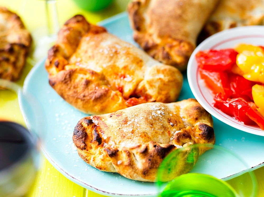 Minicalzone med mozzarella och salami blir nästan som en pirog. Gott som tilltugg eller på picknick.