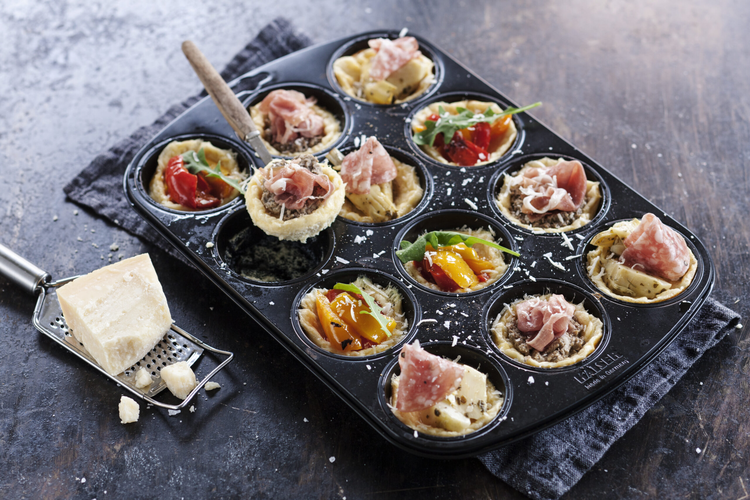 Frittata, italiensk omelett, i portionsform toppad med smaker som grillad paprika och ruccola, svampcréme och prosciutto.