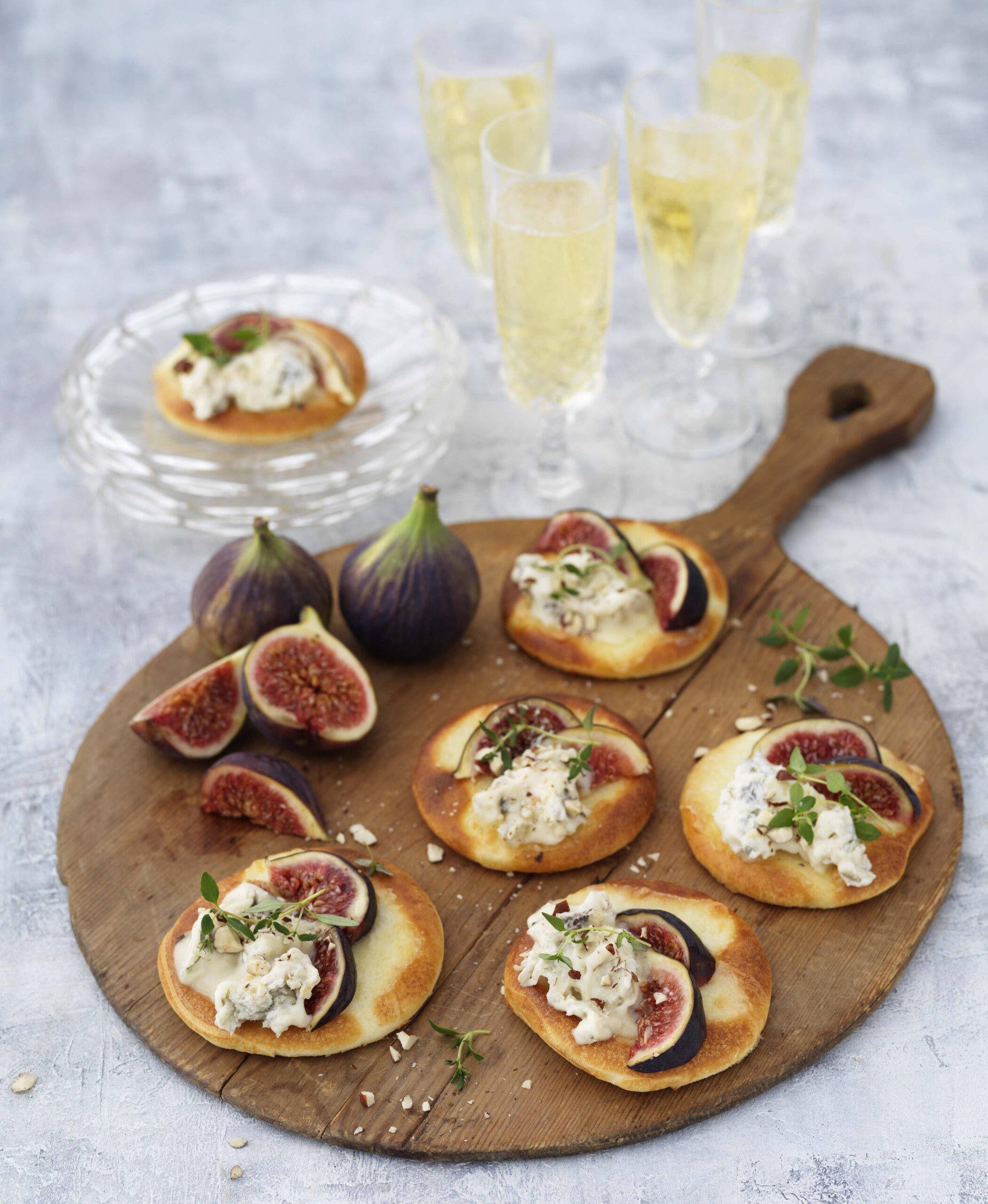 Minipizzor med tryffelgorgonzola, fikon och hasselnötter passar perfekt som aptitretare tillsammans med ett glas bubbel eller som del av en buffé.