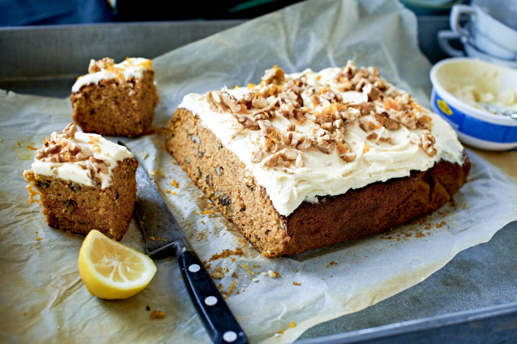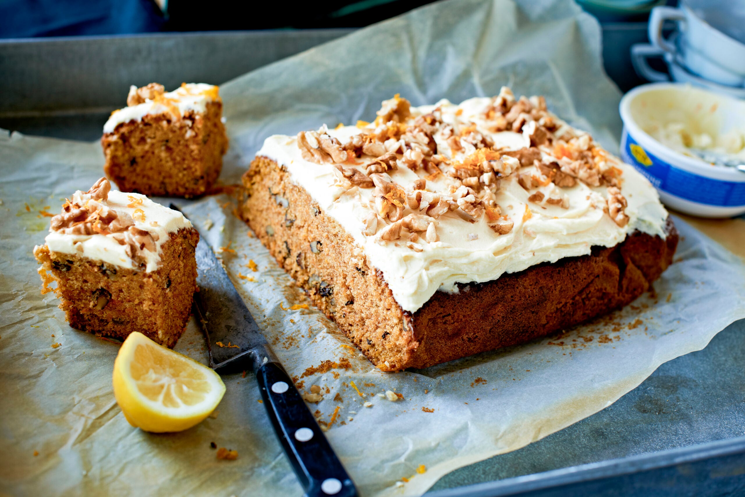 Saftig morotskaka bakad med olivolja och toppad med mascarponekräm med smak av apelsin och citron. Perfekt att servera till fikat eller som efterrätt.