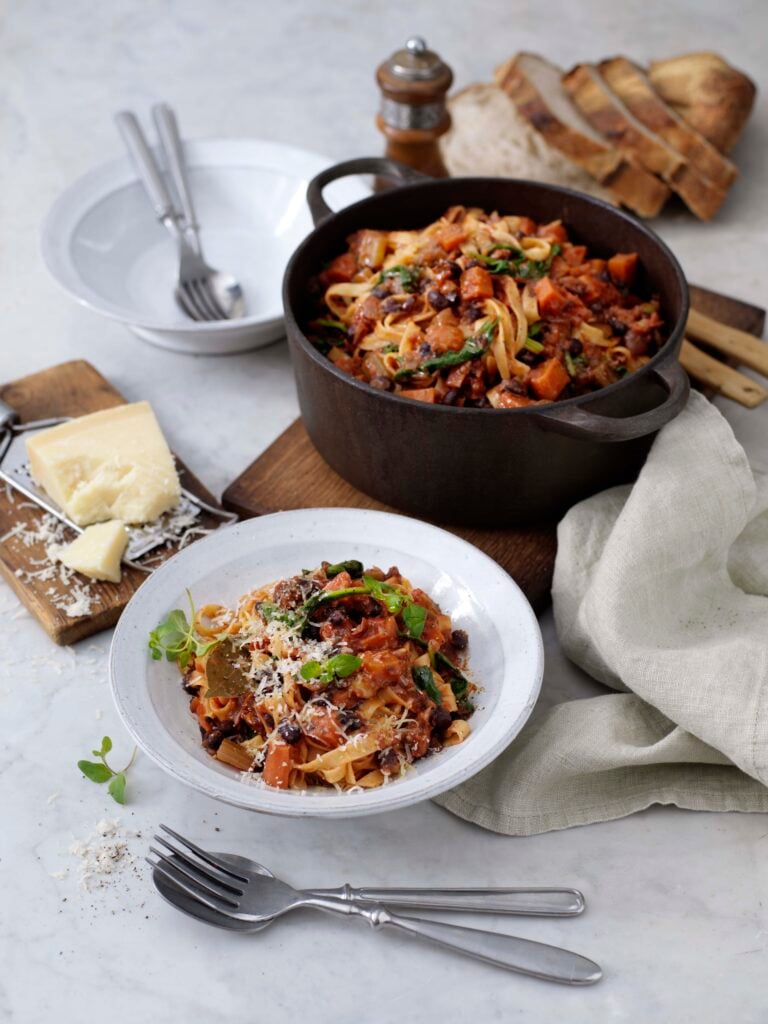 Mustig grönsaksragu med pasta tagliatelle