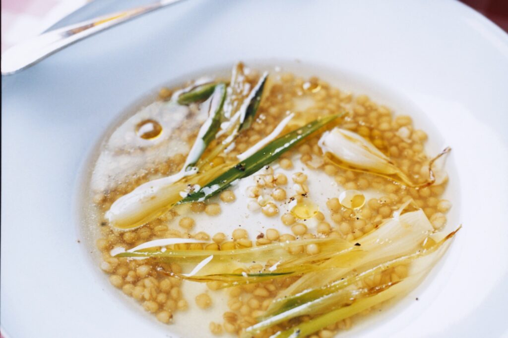 Olivdoftande soppa med salladslök och matvete
