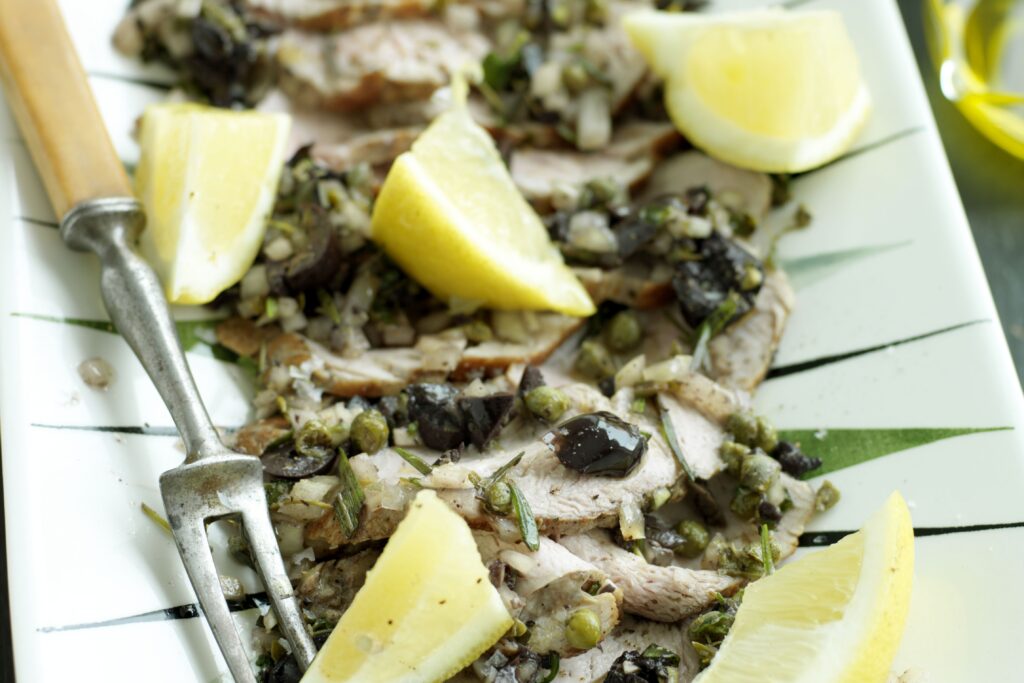 Fläskfilén bakas i ugn och marineras sedan i ett dygn i vitlök, kapris och oliver. Serveras med citronklyftor och ett gott bröd!