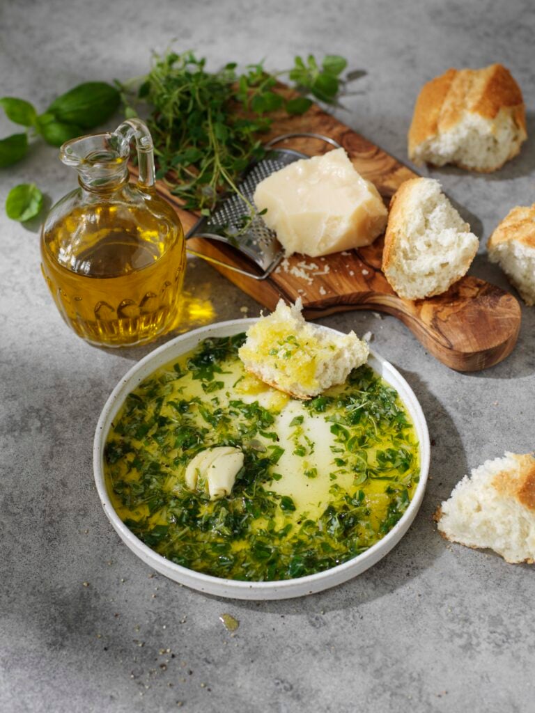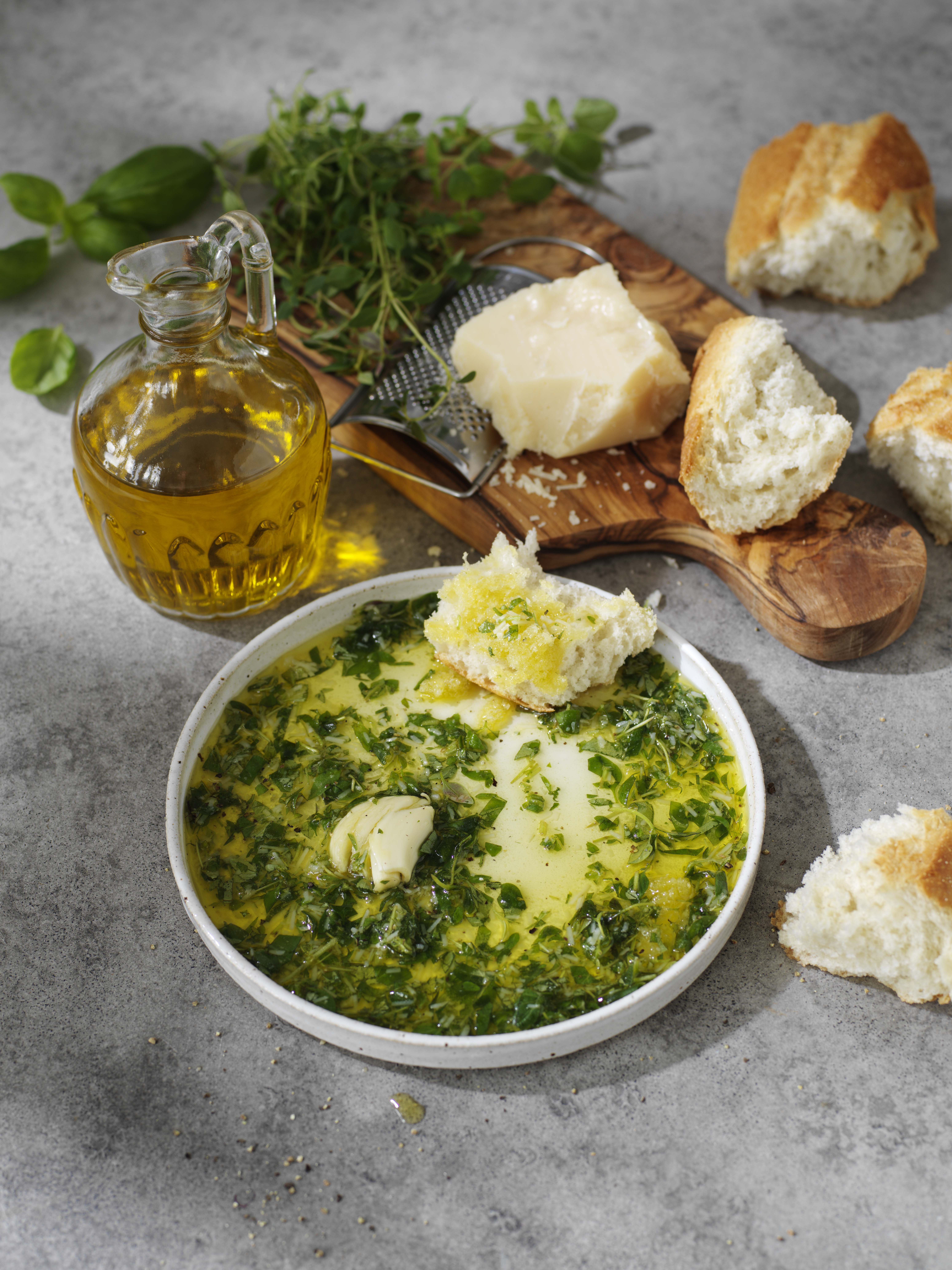 Den här olivoljedippen blev, vi på Zetas provkök, serverade i New York på en italiensk restaurang. Personalen berättade att dippen är anledningen till att många av deras gäster blir stammisar. Det kan vi förstå- den är enkel att göra och fantastiskt god! Passar perfekt med ett glas rött vin en höstkväll eller till en immande kall dryck en varm sommardag. Egentligen passar den närsomhelst och gärna i goda vänners sällskap. Bara gör den!