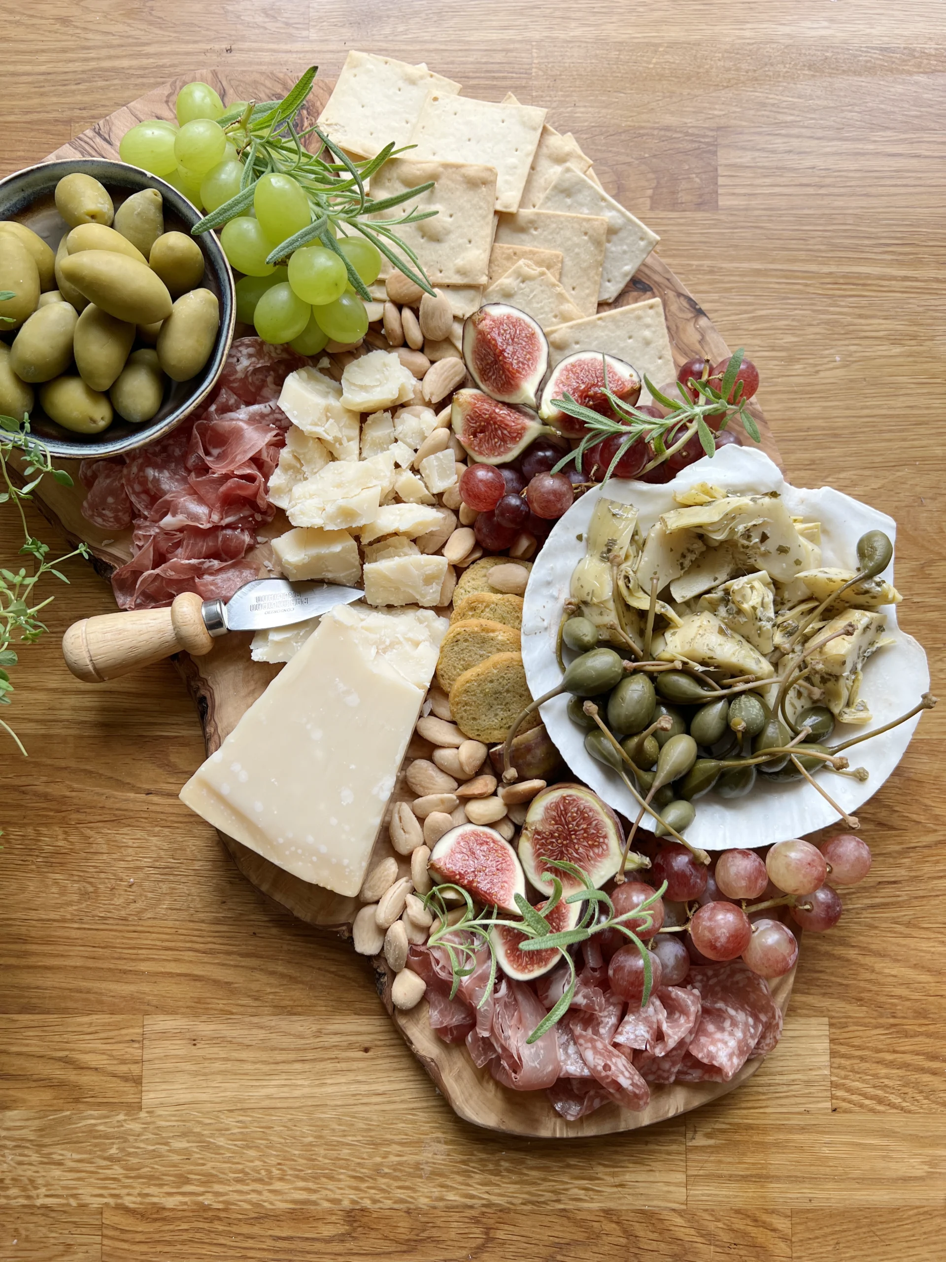 En god ostbricka med en fyllig parmesanost i centrum som får sällskap av färska fikon, cocktailkapris, oliver och marinerade kronärtskockor. Tillsammans med chark, vindruvor, aperitivokex och rostad mandel blir det en balanserad ostbricka med både sött och salt. Perfekt som aperitivo innan middagen serveras.