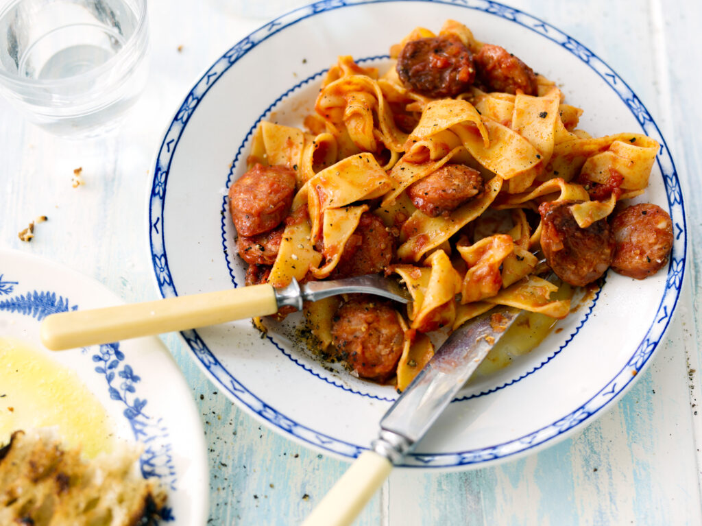 Pappardelle är en bredbandig pasta som passar utmärkt i en smakrik tomatsås med het chorizo.