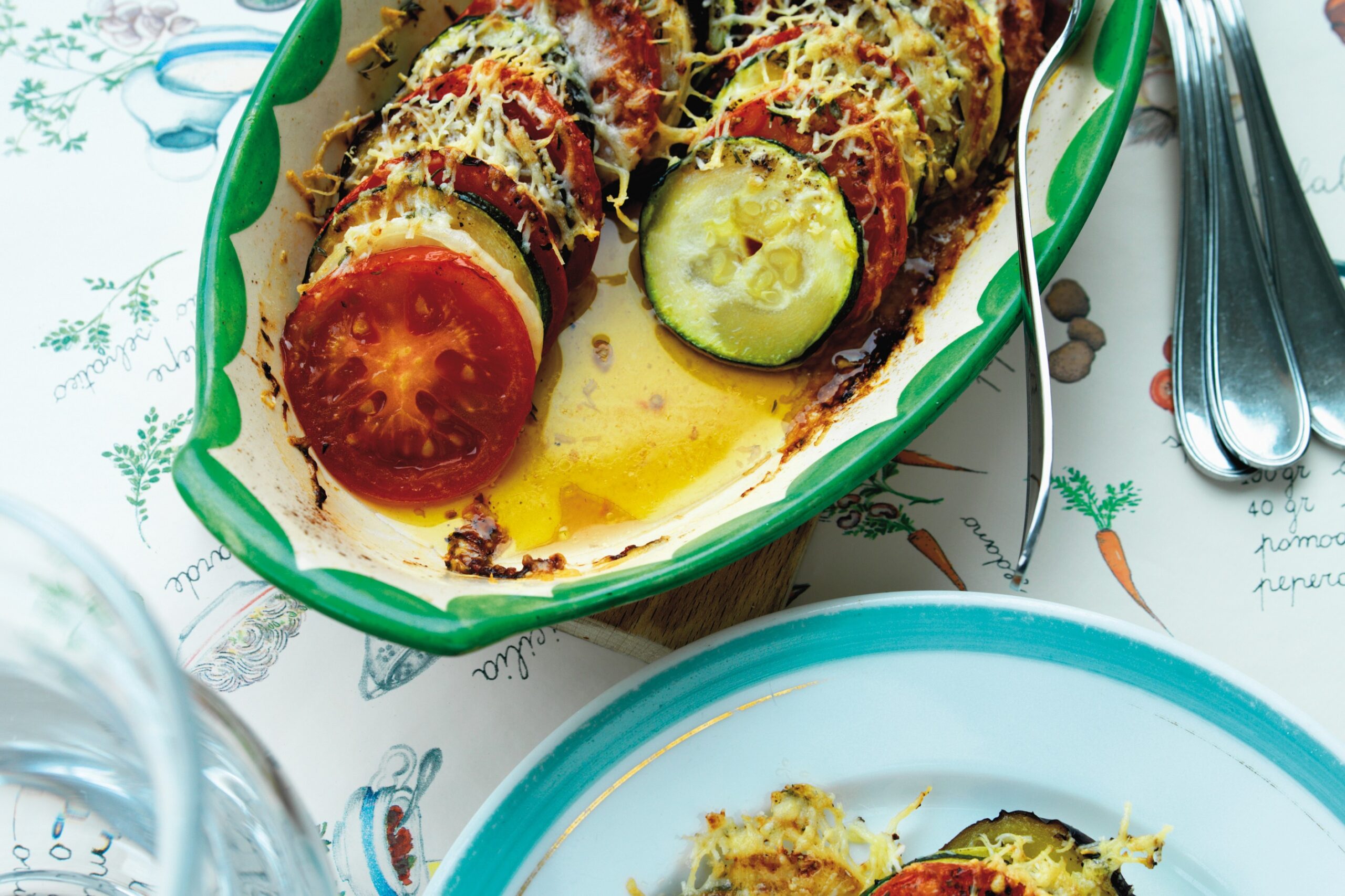 Parmesangratinerade grönsaker med färsk timjan och vitlök. Serveras med fördel till kyckling, fisk eller en bit kött.