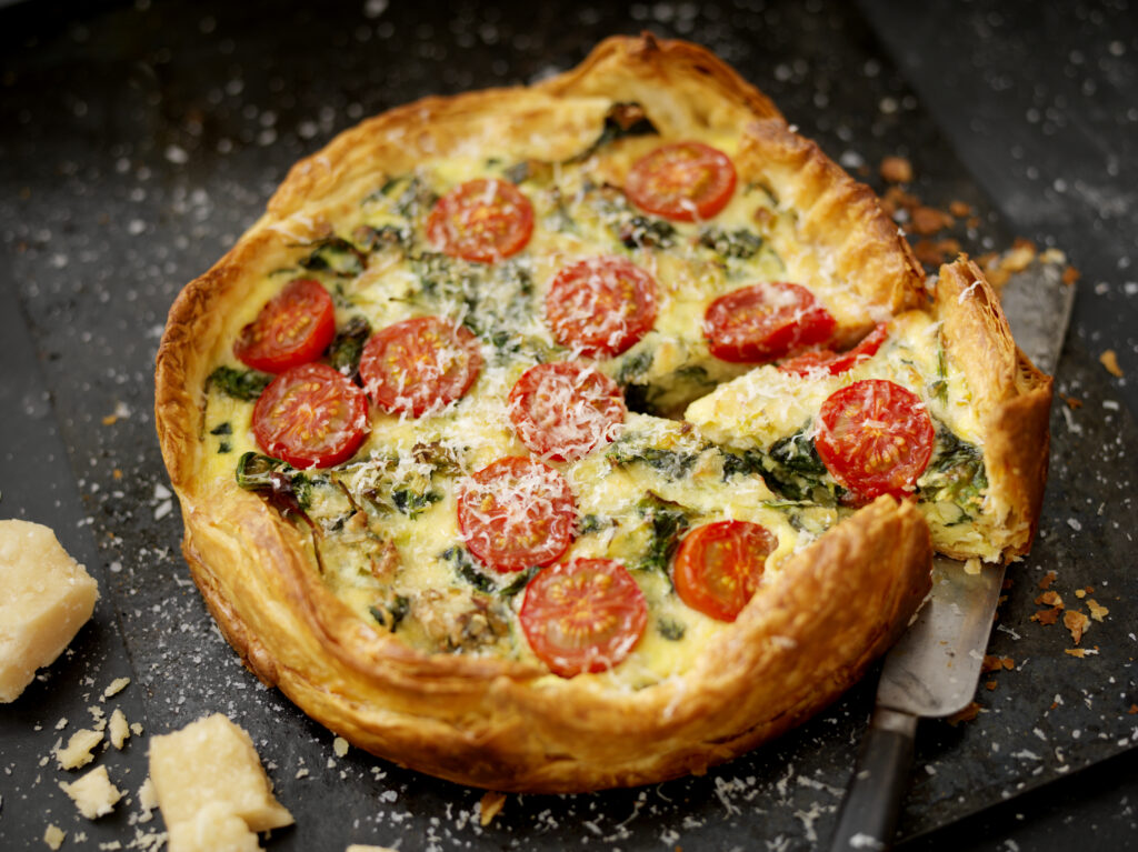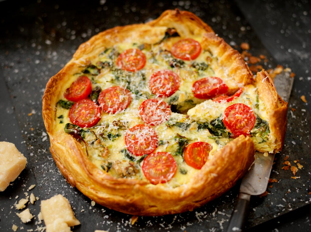 Parmesanpaj med bladspenat och körsbärstomater