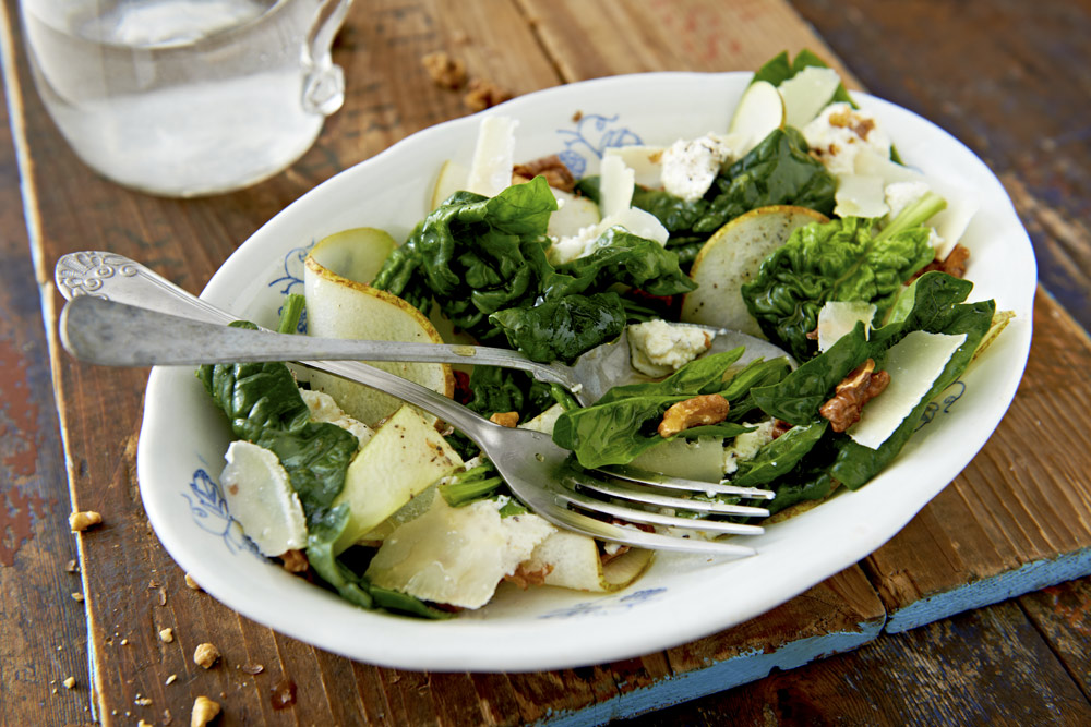Lyxig men enkel sallad med krispiga päron och rostade valnötter.