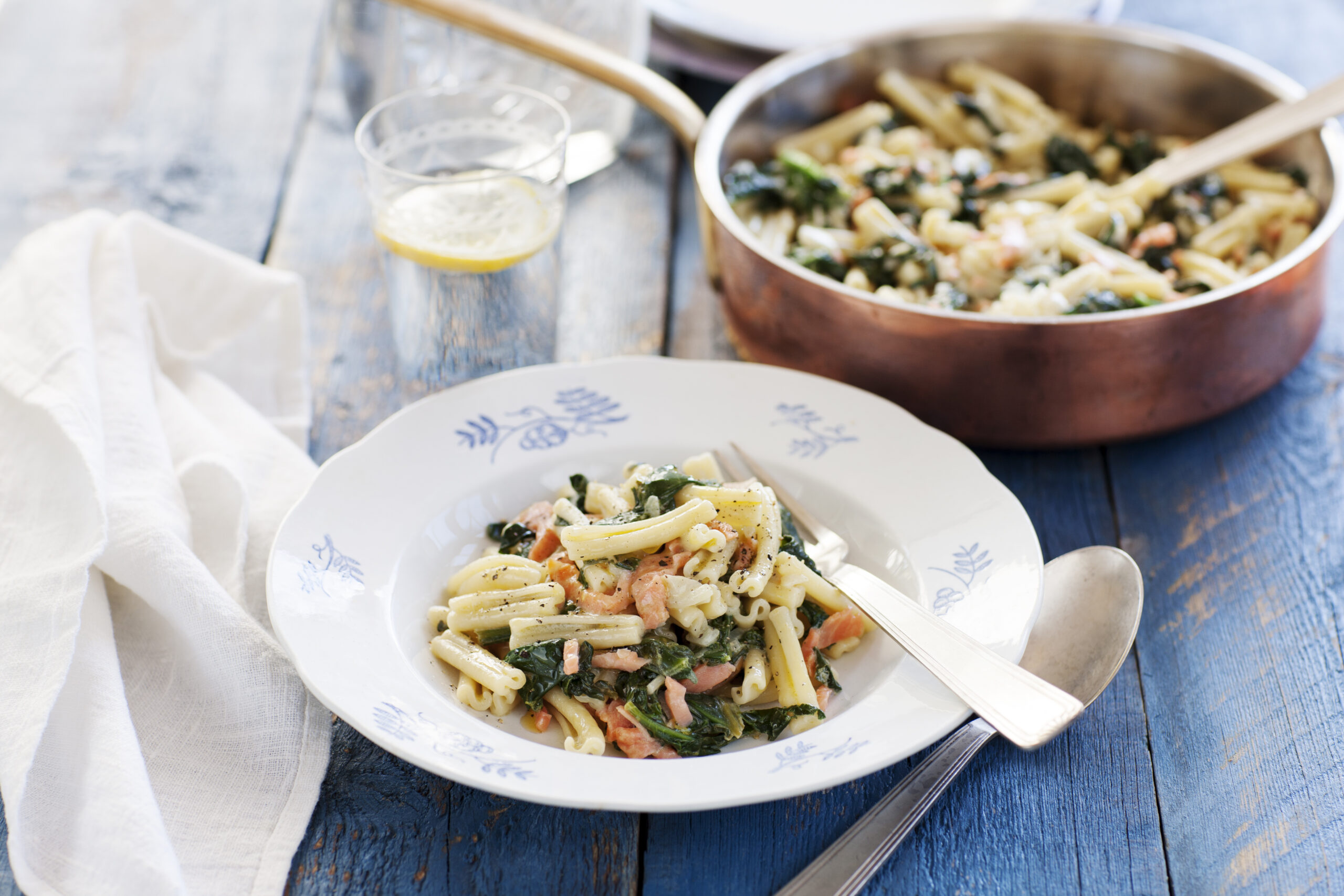 Pasta Strozzapreti med spenat och rökt lax. Mascarpone gör pastan både krämig och god. Passar fint till både vardag och fest.