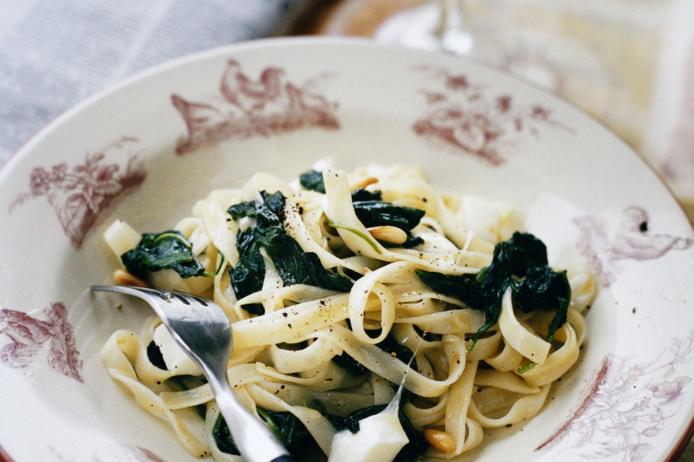 Pasta med fräst färsk spenat och vitlök med pinjenötter och krämig mozzarella på toppen. En god och enkel pasta när du har ont om tid.