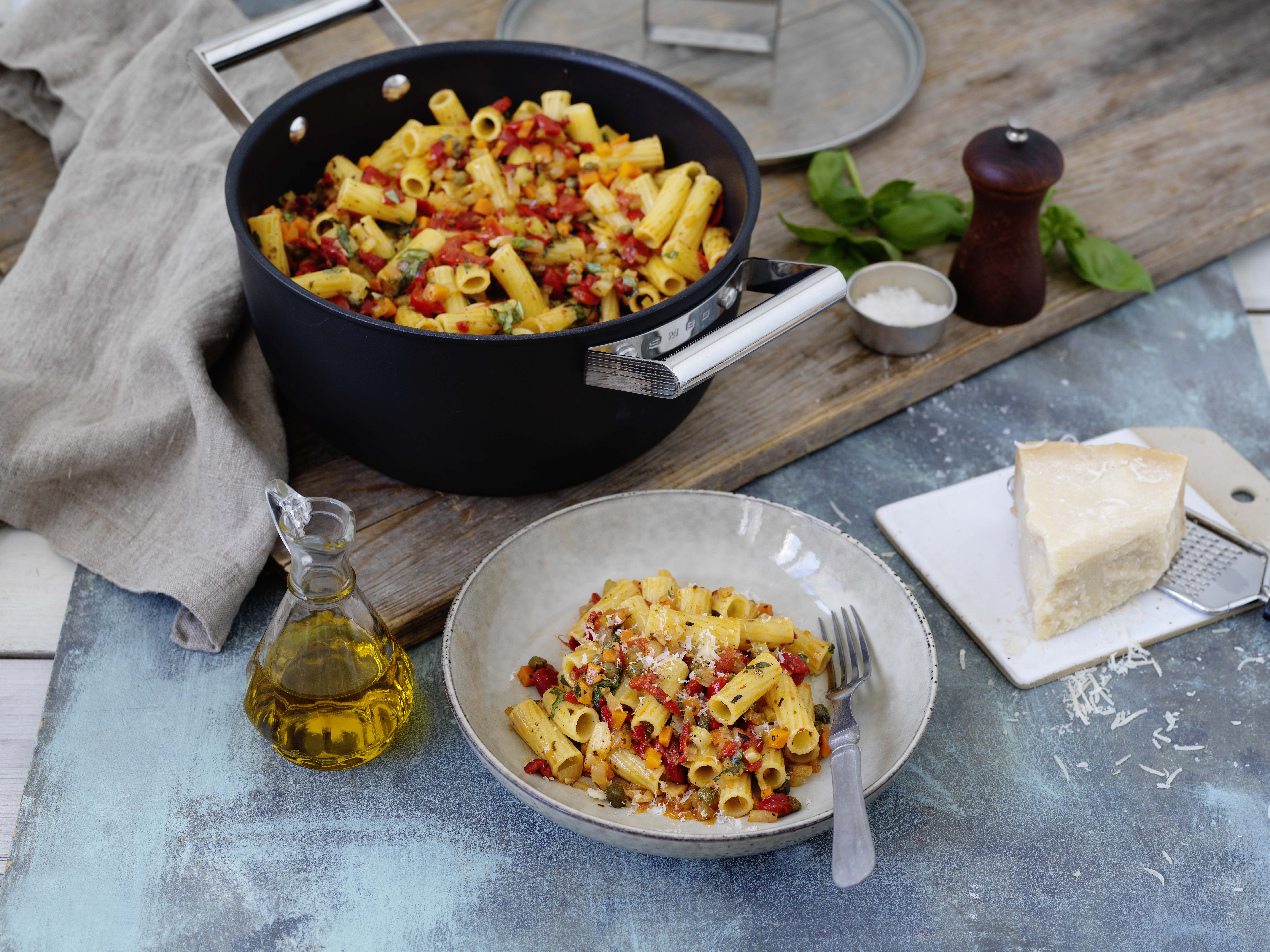 Enkel vardagspasta med klassiska italienska smaker. Toppa med nyriven parmesanost och nymalen svartpeppar för bästa smak.