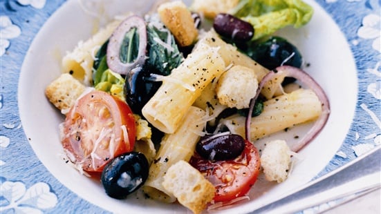 Cerignola oliver, blandade bönor, tomater, pasta, gemsallad och krispiga krutonger…
