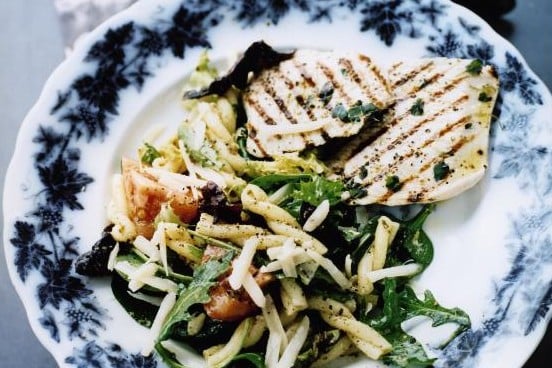 Pastasallad med grillad kalkon och pesto. Kryddig och enkel pastarätt perfekt att ta med på picknick eller äta till lunch.
