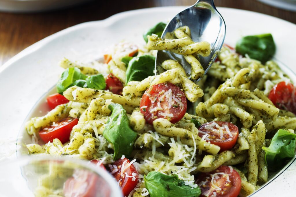 Härlig pastasallad i både färg och smak med pesto alla genovese, cocktailtomater och parmesan. Enkel och snabblagad pastasallad som passar fint att ta med på picknick eller ha som tillbehör till kyckling, fisk eller kött.