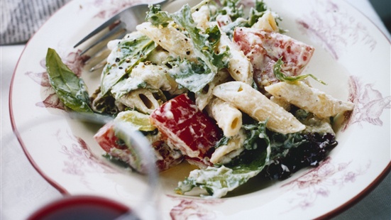 Avokado och ricotta bidrar med krämiga och milda smaker till denna pastasallad