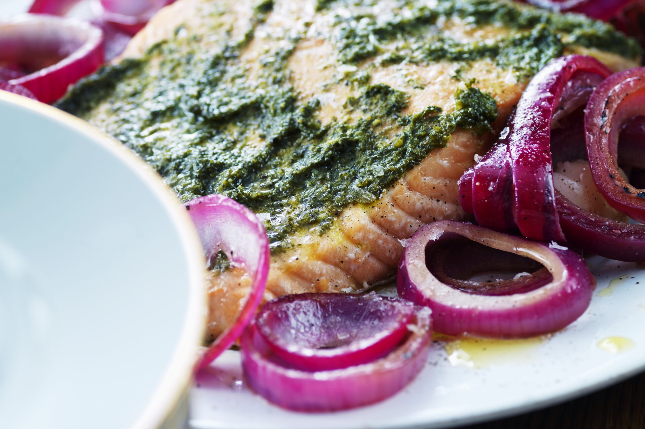 En långsam stekning i ugn på en lägre temperatur gör att laxen blir mörare och saftigare. Servera den pestobakade laxen med marinerad rödlök.