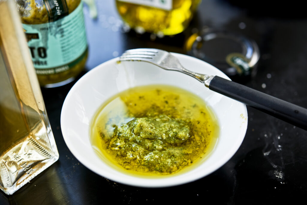 En vinägrett med pesto som grund sätter smak på det mesta. Allt i från salladen till potatis eller pastasalladen.