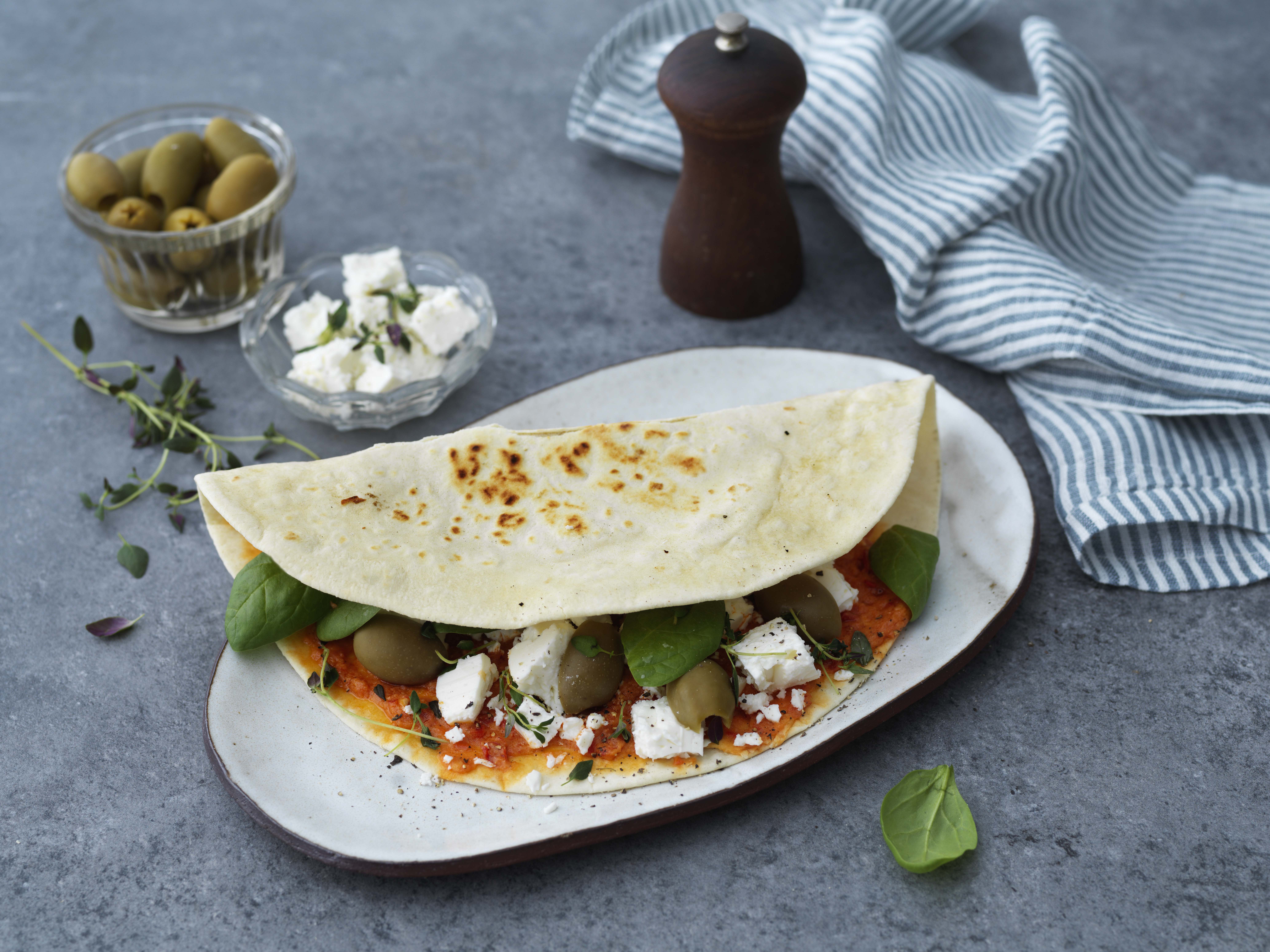 Piadina är ett klassiskt italienskt tunnbröd bakat med olivolja som här får en smakrik twist. Fyll den med het pesto, krämig fetaost och saftiga oliver för en kombination som verkligen väcker smaklökarna. Perfekt att njuta av som en lätt lunch eller ett mättande mellanmål. Med denna piadina får du en smakbit av både Italien och Grekland – snabbt, enkelt och oemotståndligt gott!