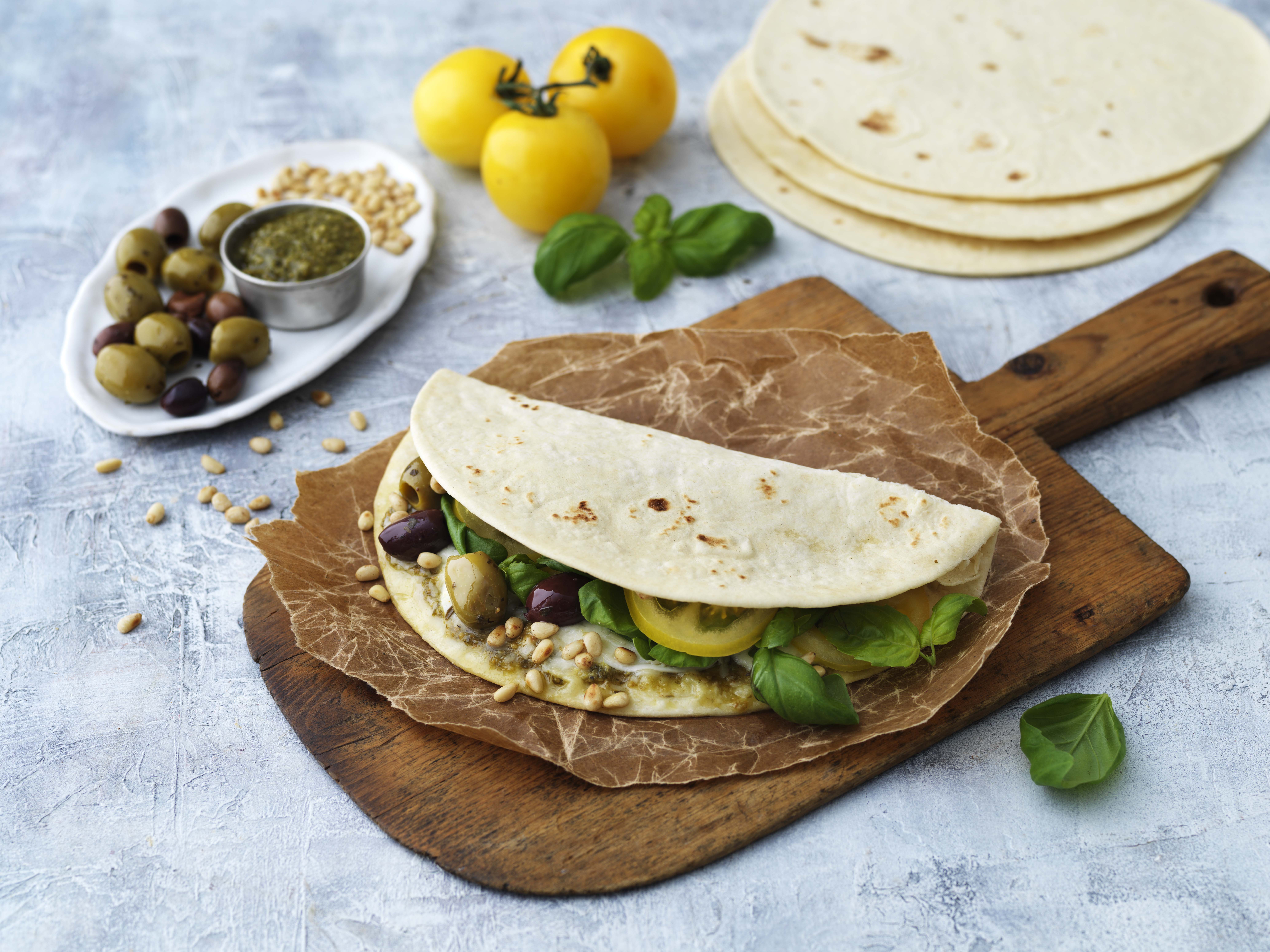 Piadina med pesto och oliver