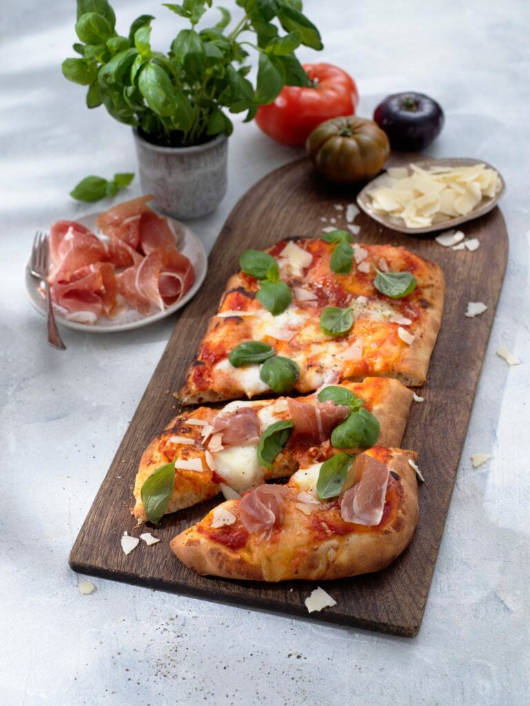 Pinsa kan bäst beskrivas som ett mellanting mellan pizza och focaccia med sitt ursprunglig från Rom, Italien. Toppa din pinsa med dina favoritsmaker och servera antingen som lunch eller middag. Här har vi valt klassiska italienska smaker som mozzarella, prosciutto och parmesan. Pinsan går lika bra att skära i mindre bitar och bjuda på som aptitretare till drinken.