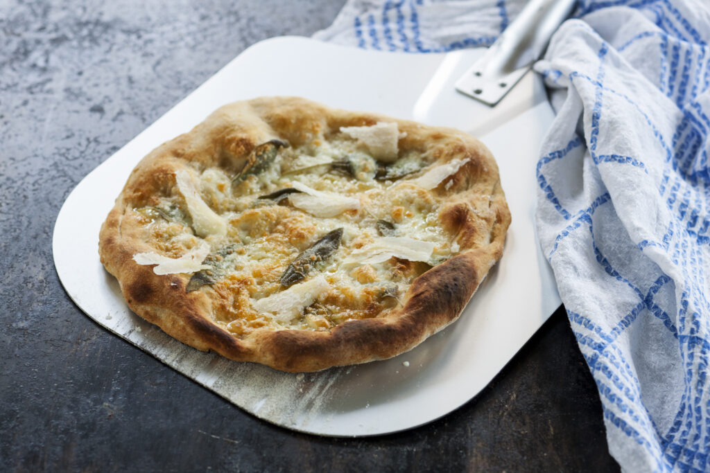 Pizza Bianca med buffelmozzarella. Pizza Bianca är en pizza utan tomatsås.