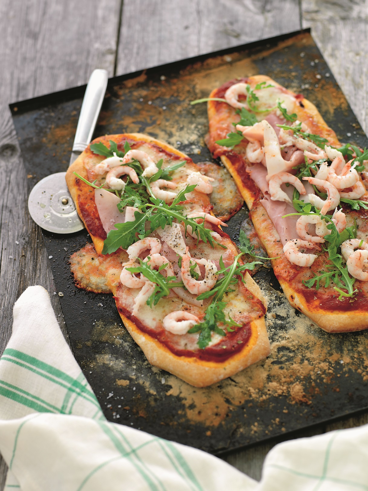 Räkpizza med kokt skinka och rucola. Toppingen läggs på efter gräddning för bästa smakupplevelse.