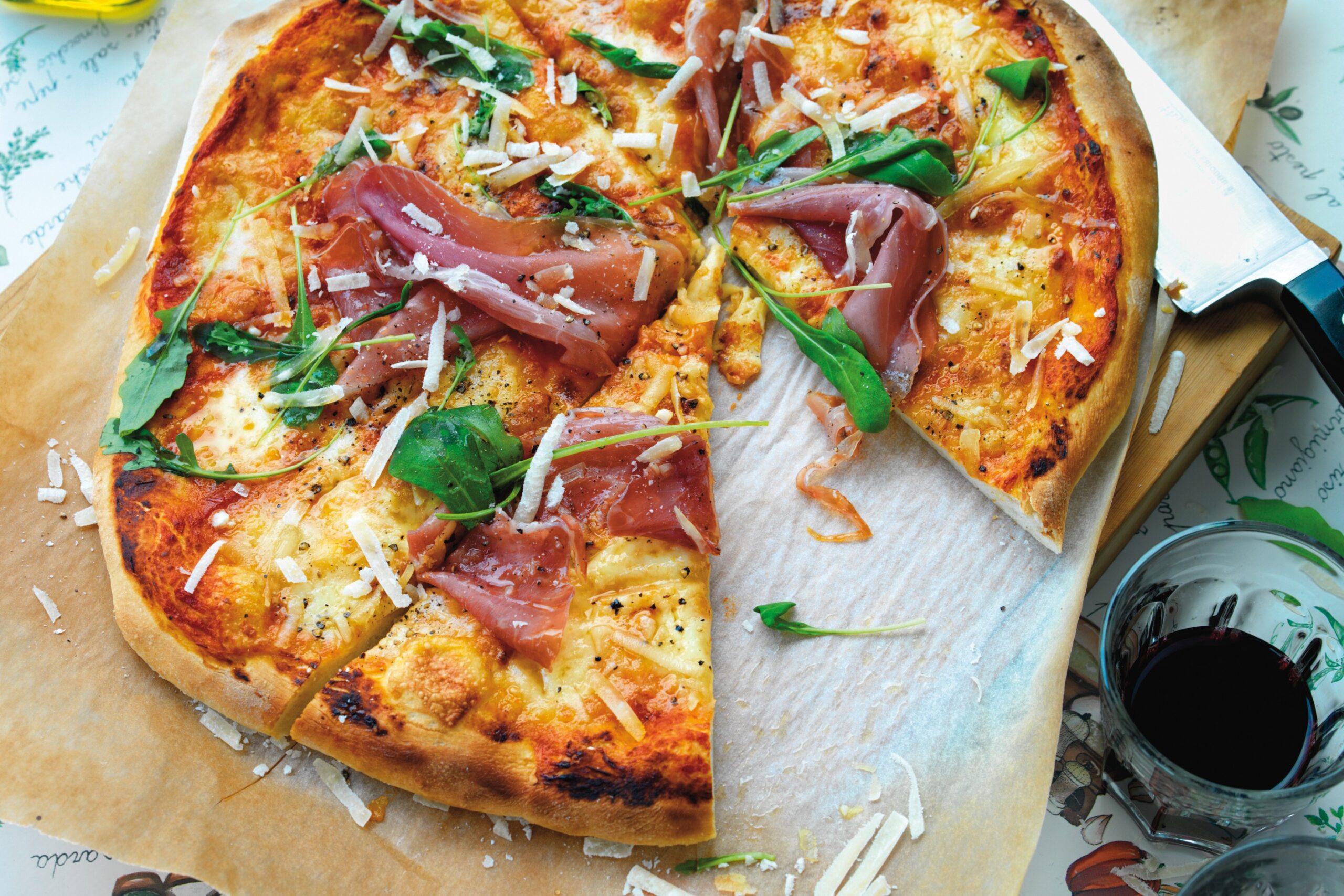 Pizza med mozzarella och parmesan som toppas med italiensk prosciutto och ruccola.