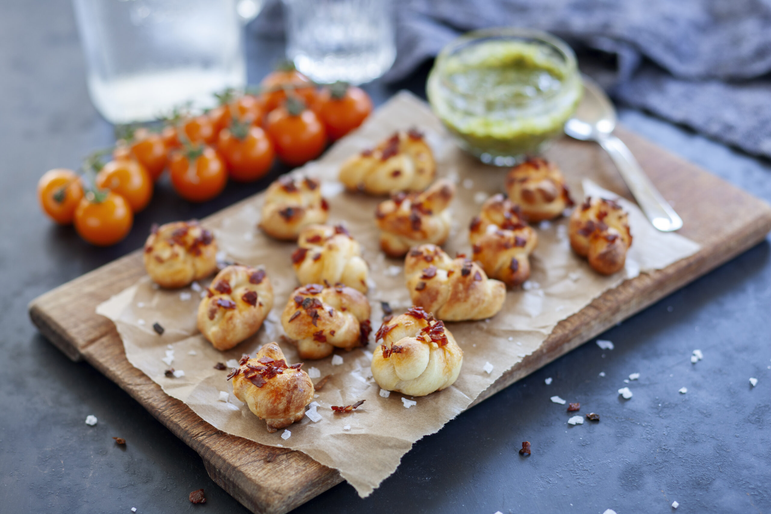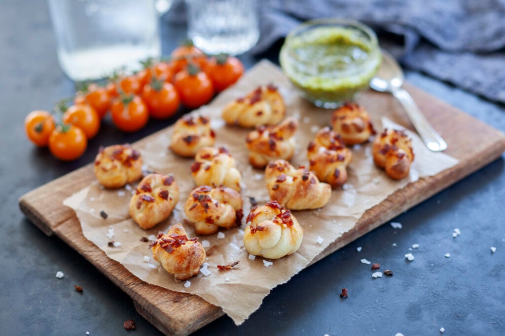 Små pizzamunsbitar med salami, vitlök och pesto som passar utmärkt som tilltugg till mingel och fest.