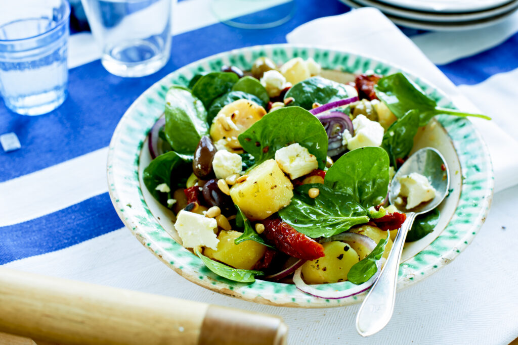 Feta, pinjekärnor och soltorkade tomater lyfter denna goda potatissallad.