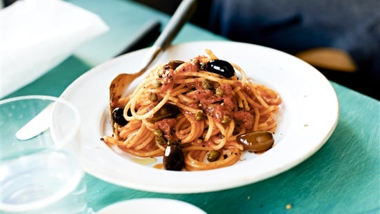Spaghetti Puttanesca är en tomatbaserad pastarätt med sälta från kapris, oliver och sardeller.