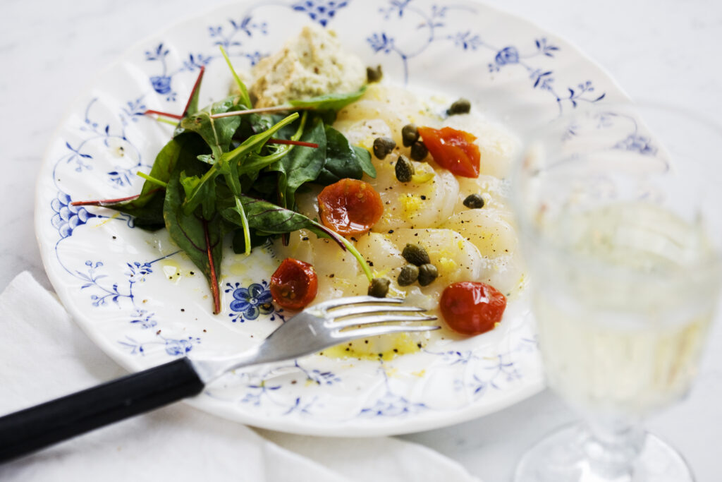 Pilgrimsmussla marinerad i olivolja och citron serverad tillsammans med kräm på kronärtskocka är en fantastisk förrätt.