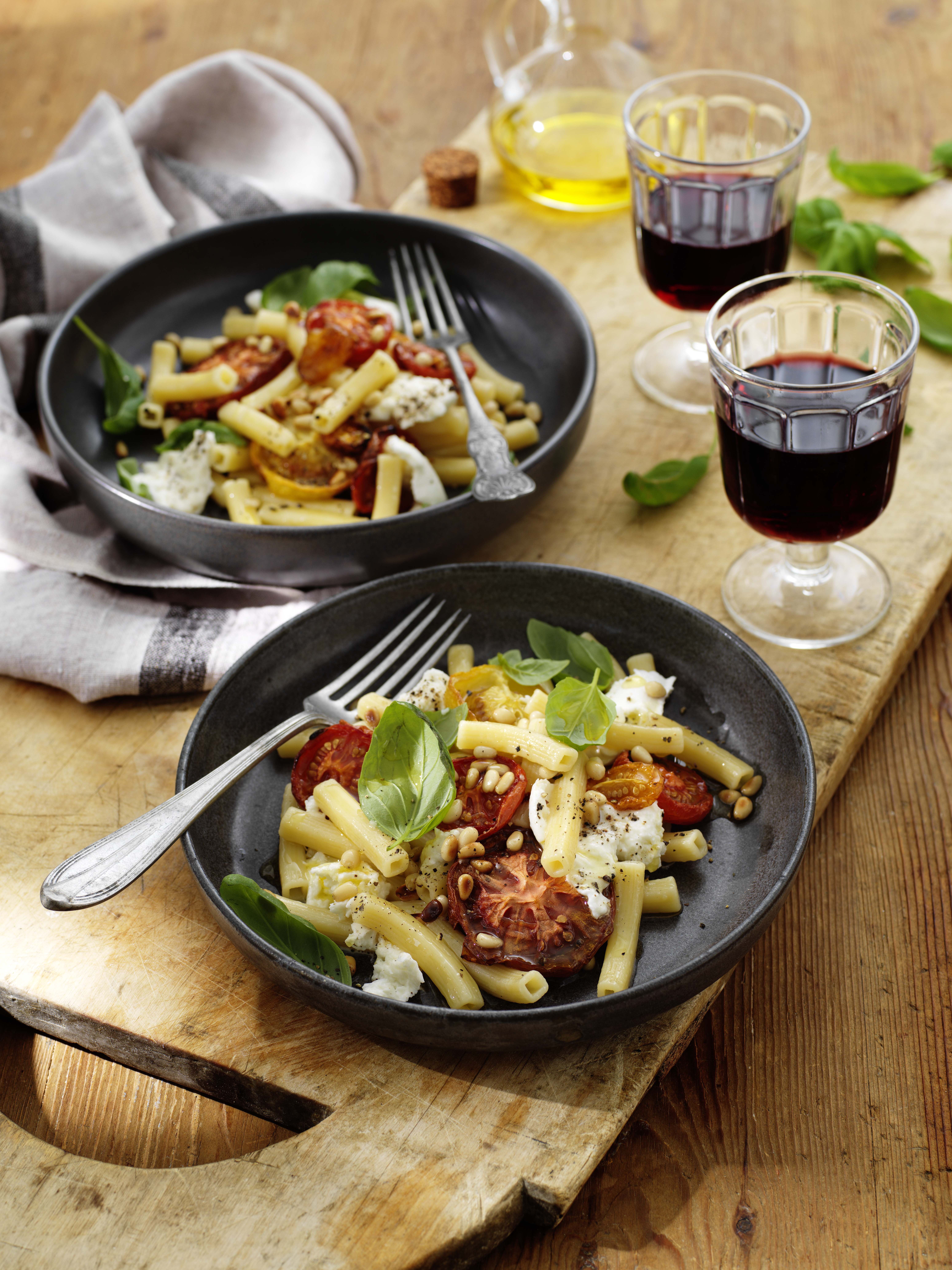 Rigatini quadri med ugnsbakad tomat och burrata