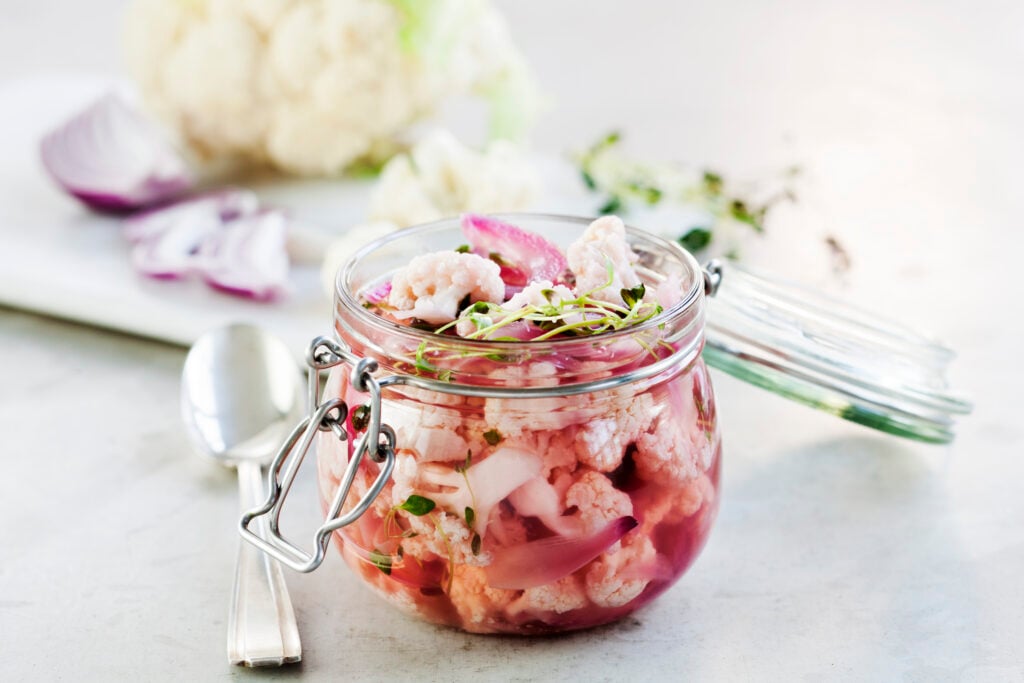Picklad blomkål och rödlök med fruktigt sötsyrlig vinäger. Passar utmärkt som tillbehör till en chark- eller ostbricka eller som en en del av buffén.