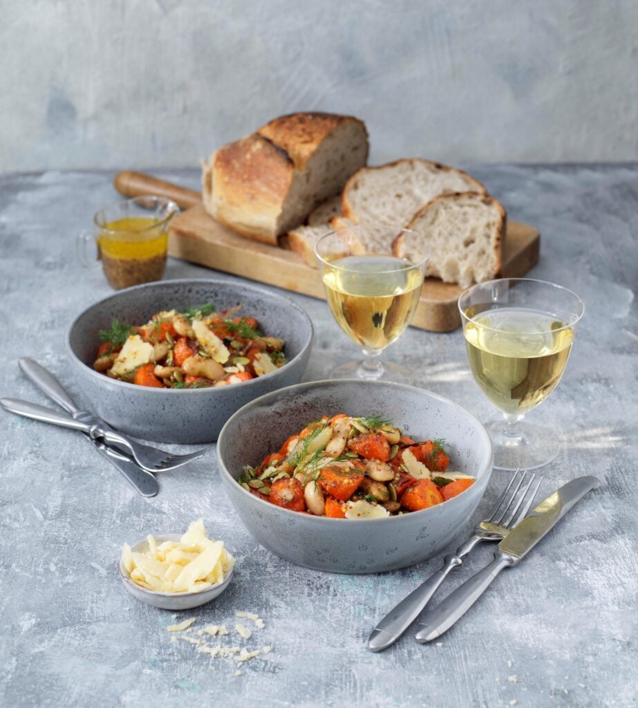 En ljummen mättande sallad som går fint att äta som den är med en bit bröd och färskost eller som tillbehör till kött eller fisk.