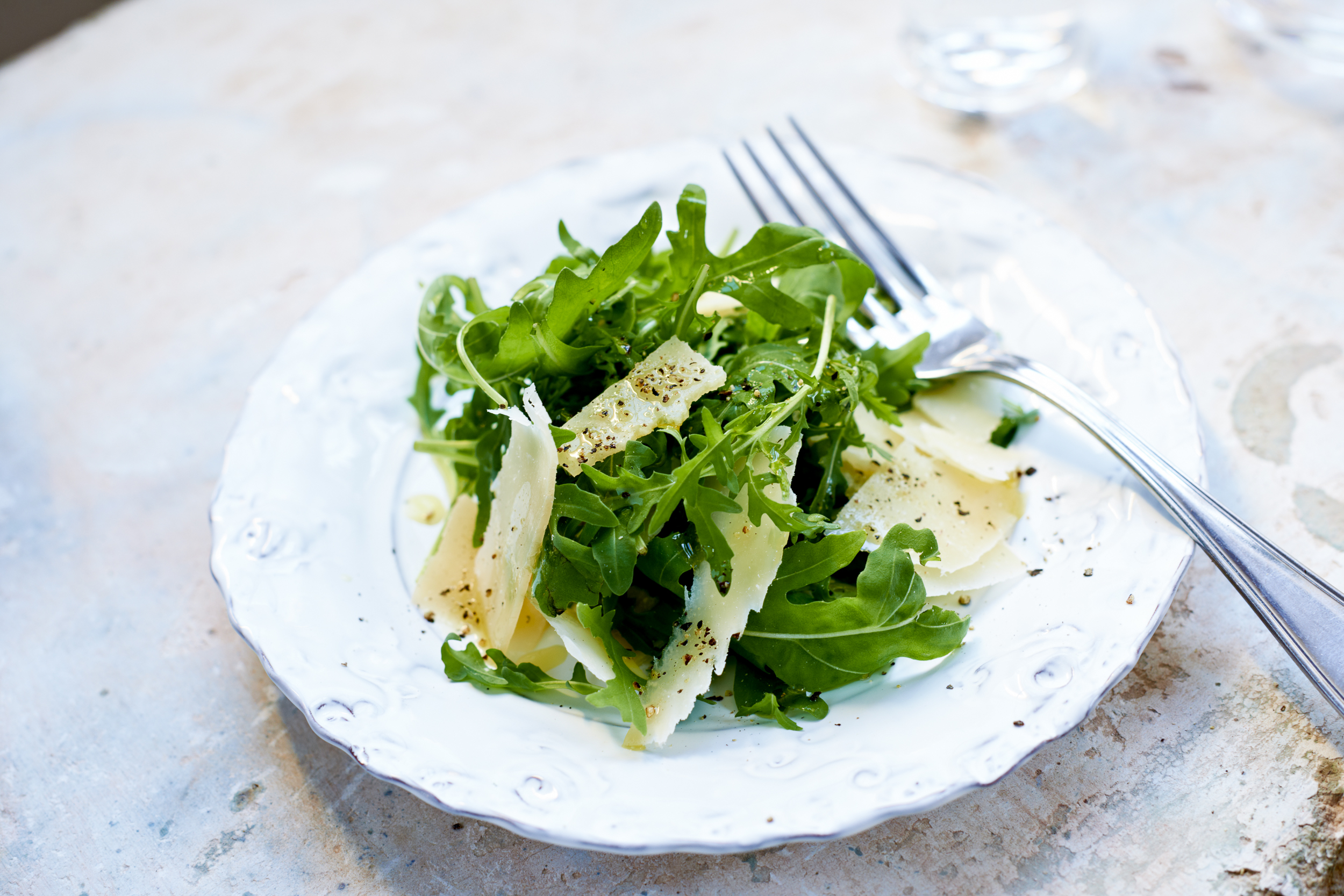 Enkel sallad med rucola och en god parmesan, smaksatt med citron och svartpeppar. Servera gärna en rucolasallad som tillbehör till middagen.