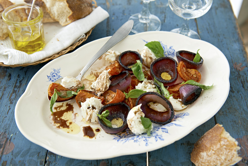 Sallad med buffelmozzarella, ugnsrostad lök och tomater.
