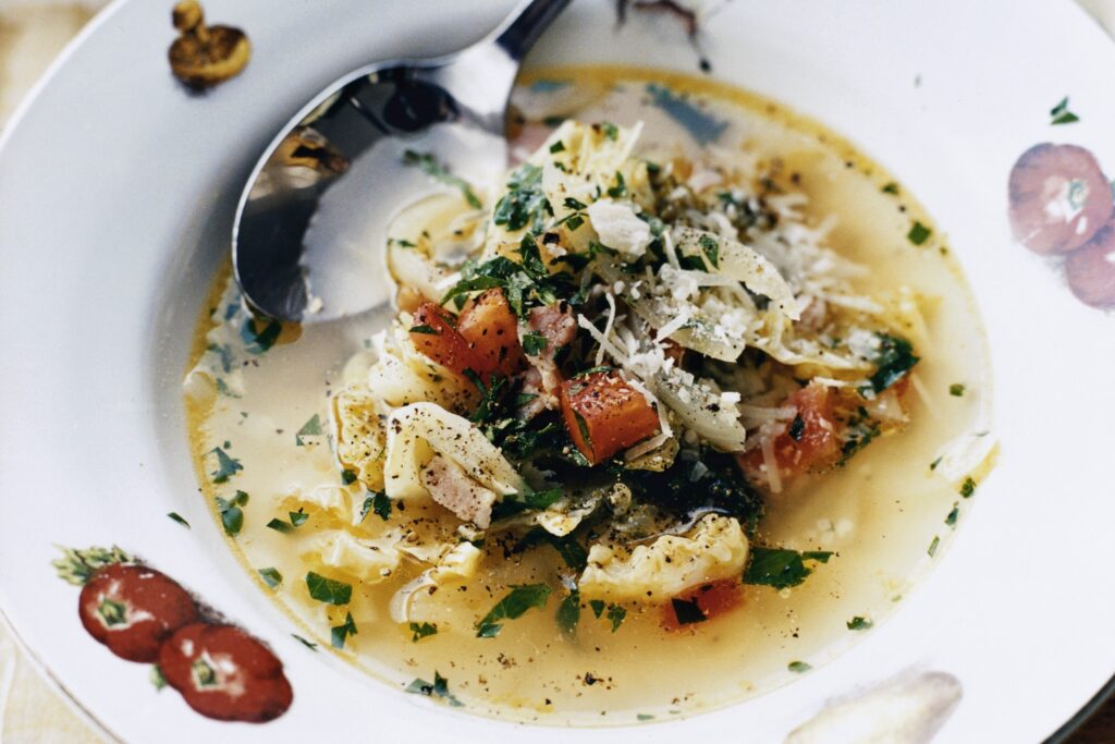 En mustig soppa på savoykål, tomater, Grana Padano och tärnad pancetta.