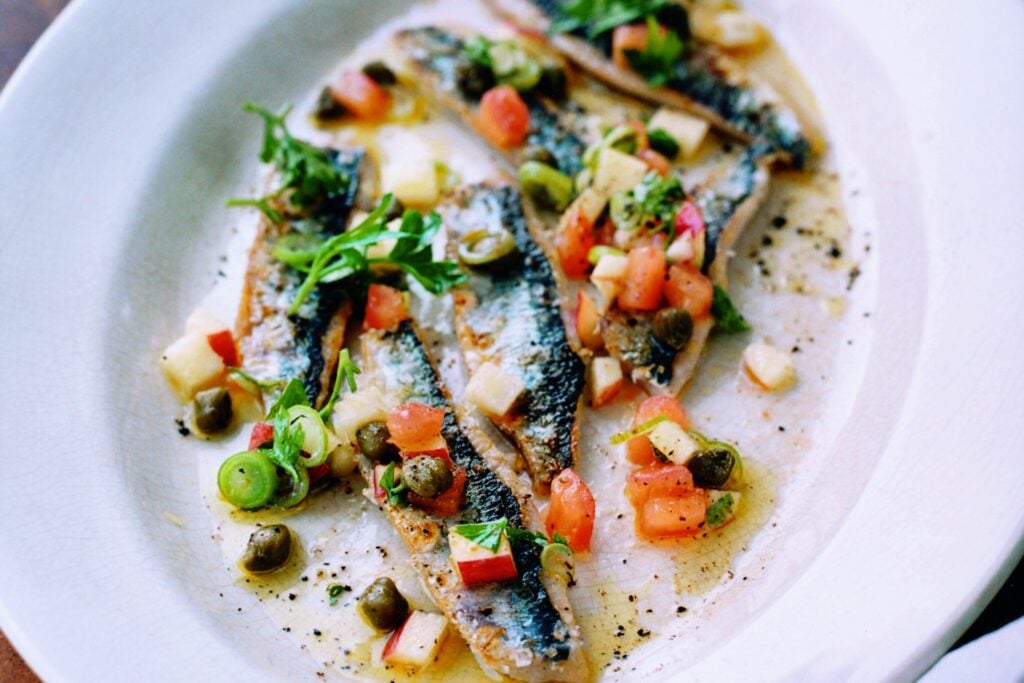 Strömning som sotats i stekpanna med havssalt och som serveras med en äpple, kapris och tomatvinägrett. Toppas med pinjenötter.