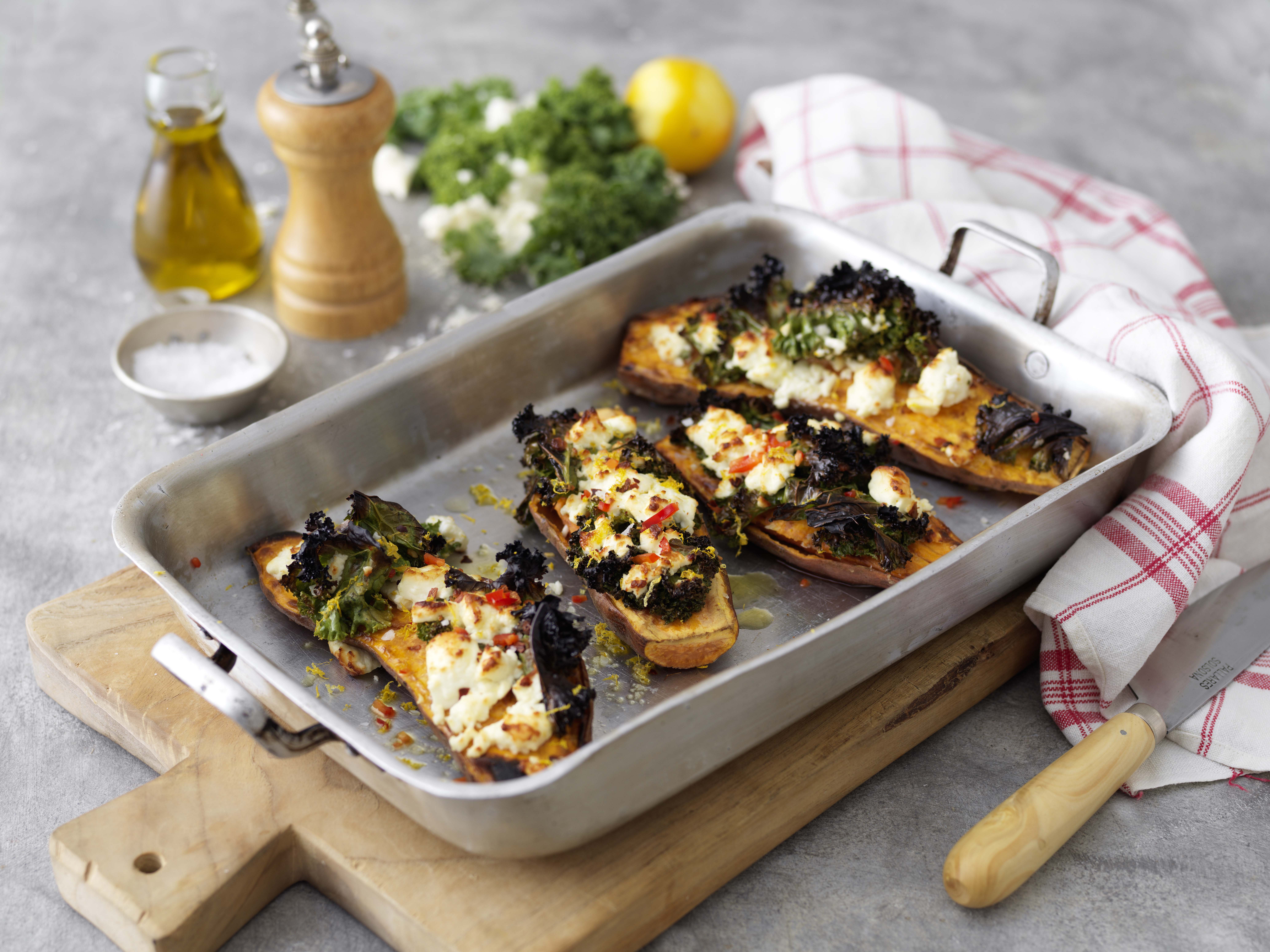 Sötpotatis med fetaost och chili är en perfekt kombination av smaker, sött, salt och lite kryddigt. Passar lika bra som tillbehör som egen vegetarisk rätt.