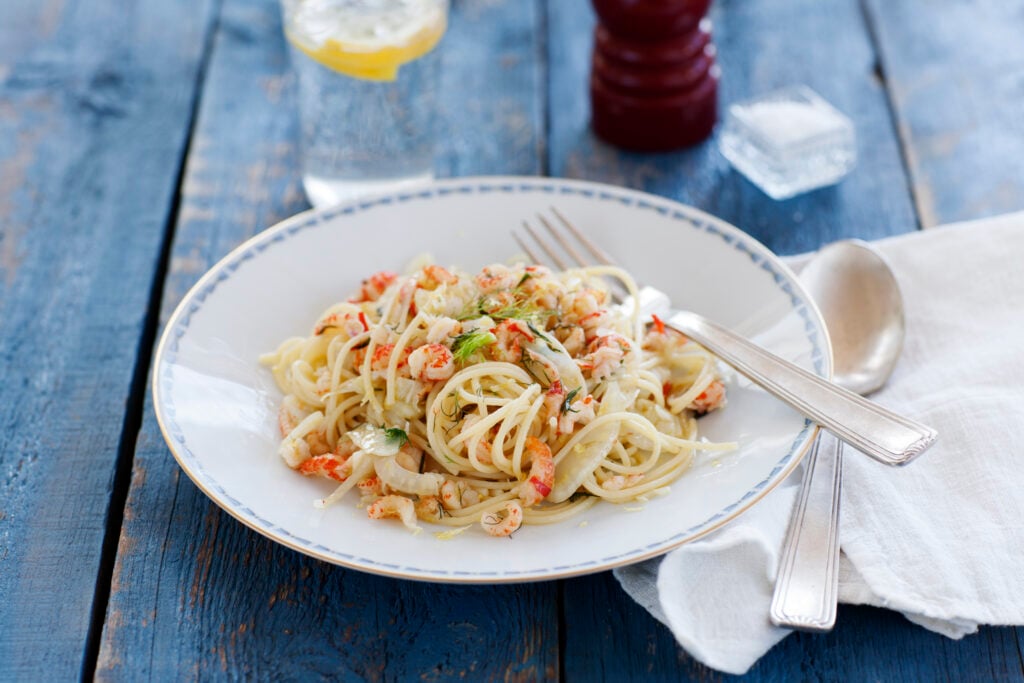 Pasta med en smakrik kombination av fänkål och kräftor. För extra sting tillagas fänkålen med vitlök och chili som sedan blandas ihop med spaghettin och kräftstjärtar.
