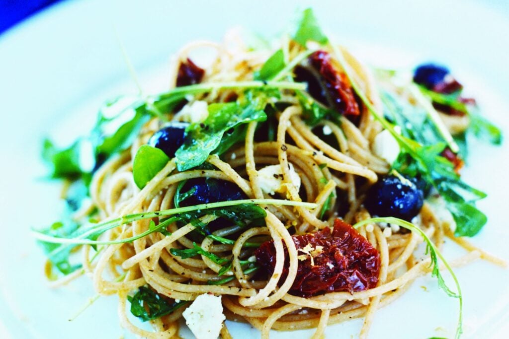 Spaghetti med grekiska smaker av fetaost, kalamata oliver och soltorkade tomater.